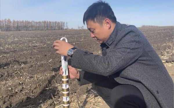 趙光農(nóng)場(chǎng)有限公司農(nóng)業(yè)科技服務(wù)中心主任李海成正在查看土壤墑情傳感器。(受訪者供圖)